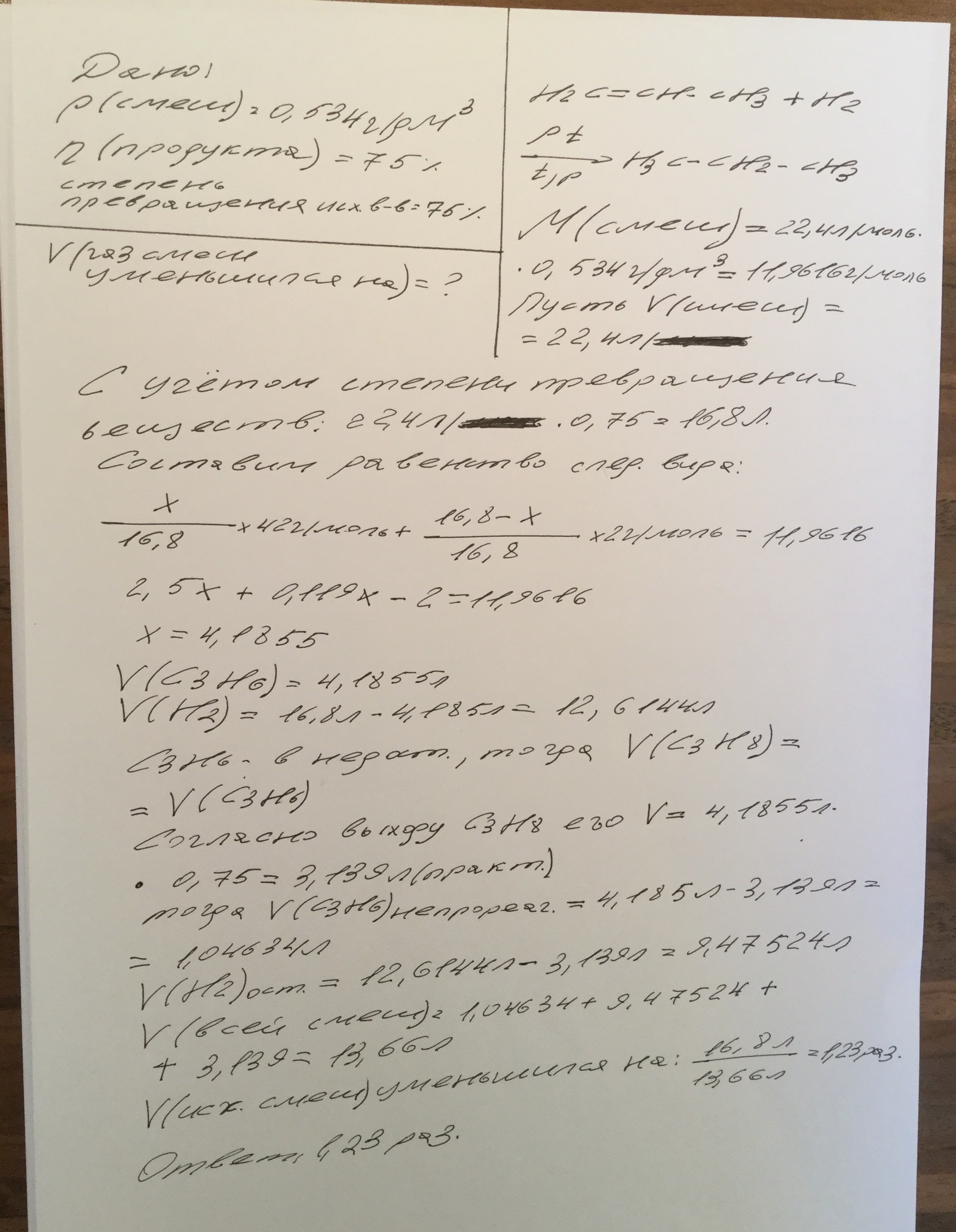 Смесь пропена и водорода, имеющая плотность (н. у.) 0,534 г/дм3, пропущена над платиной. Выход целевого продукта составил 75% и степень превращения исходных веществ равна 75%. Во сколько раз уменьшился объем газовой смеси после реакции?