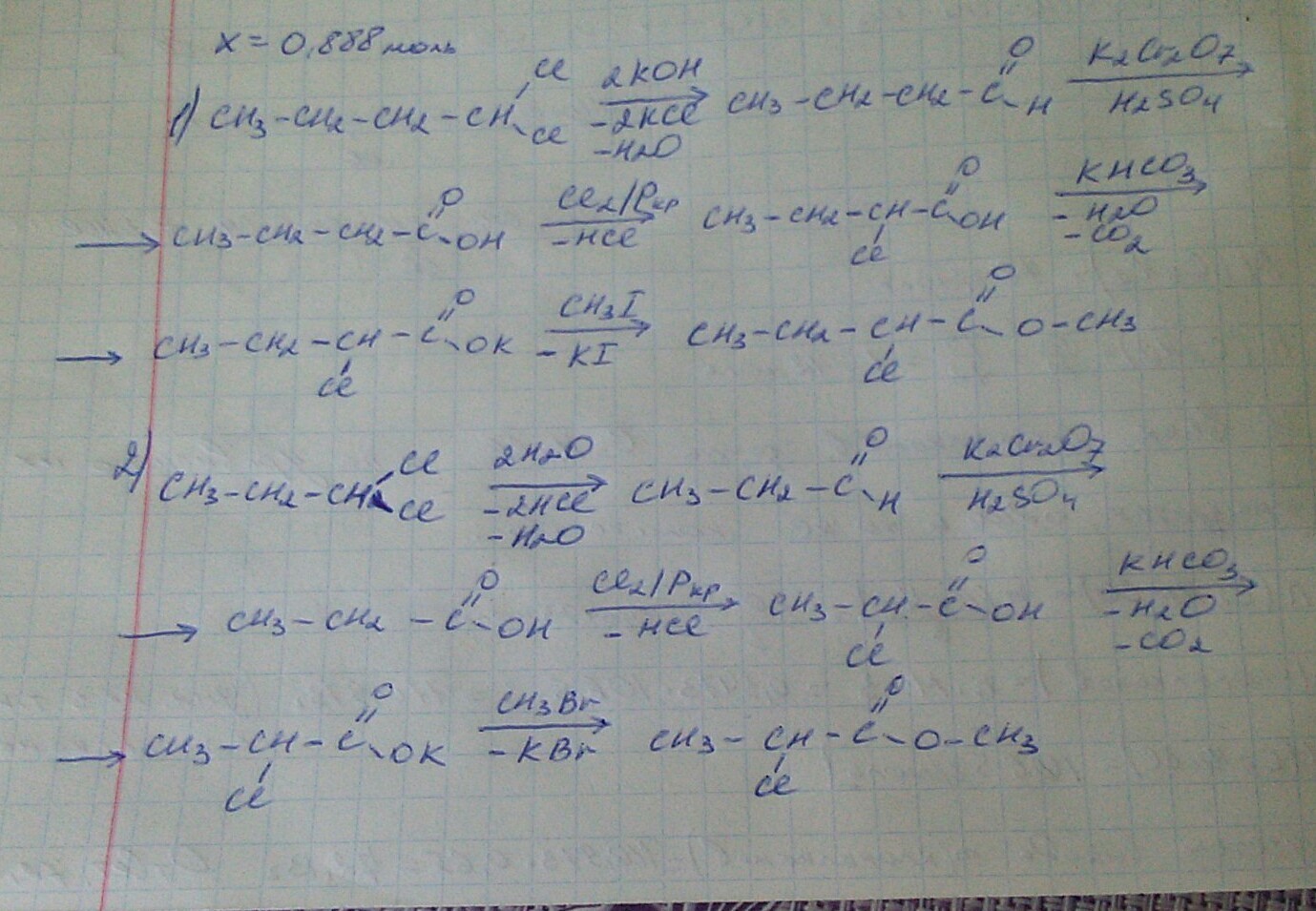 1)ch3ch2ch2chcl2--koh(водный раствор)-->x1--k2cr2o7,h2so4-->x2--cl2(p красный)-->x3--khco3-->x4--ch3i-->x5