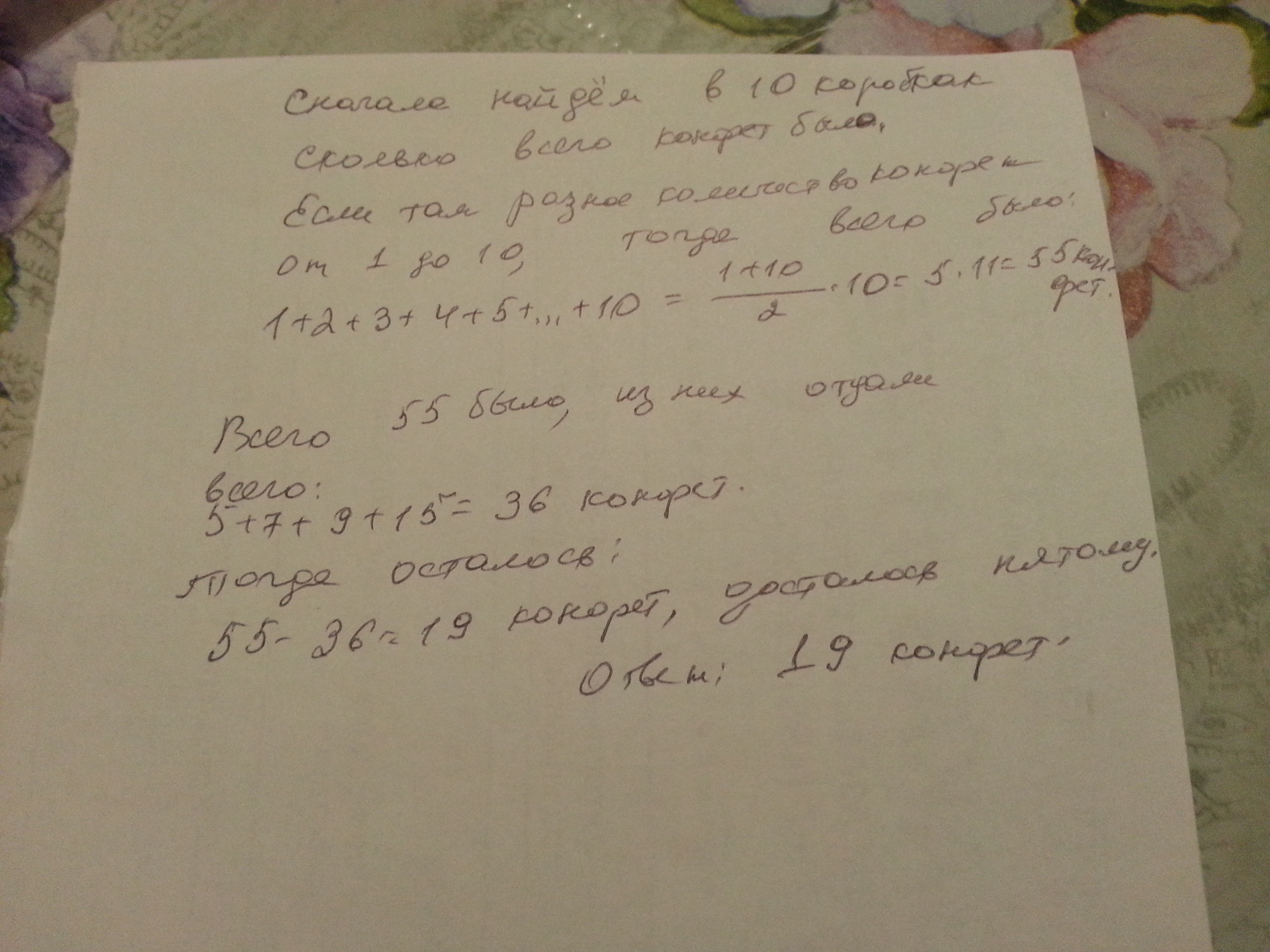 В 10 коробках лежали разное количество конфет от 1 до 10. Раздали пятерым мальчикам по 2 коробки каждому. Первому досталось 5 конфет, второву 7, третьему 9, четвертому 15. Сколько досталось конфет пятому?