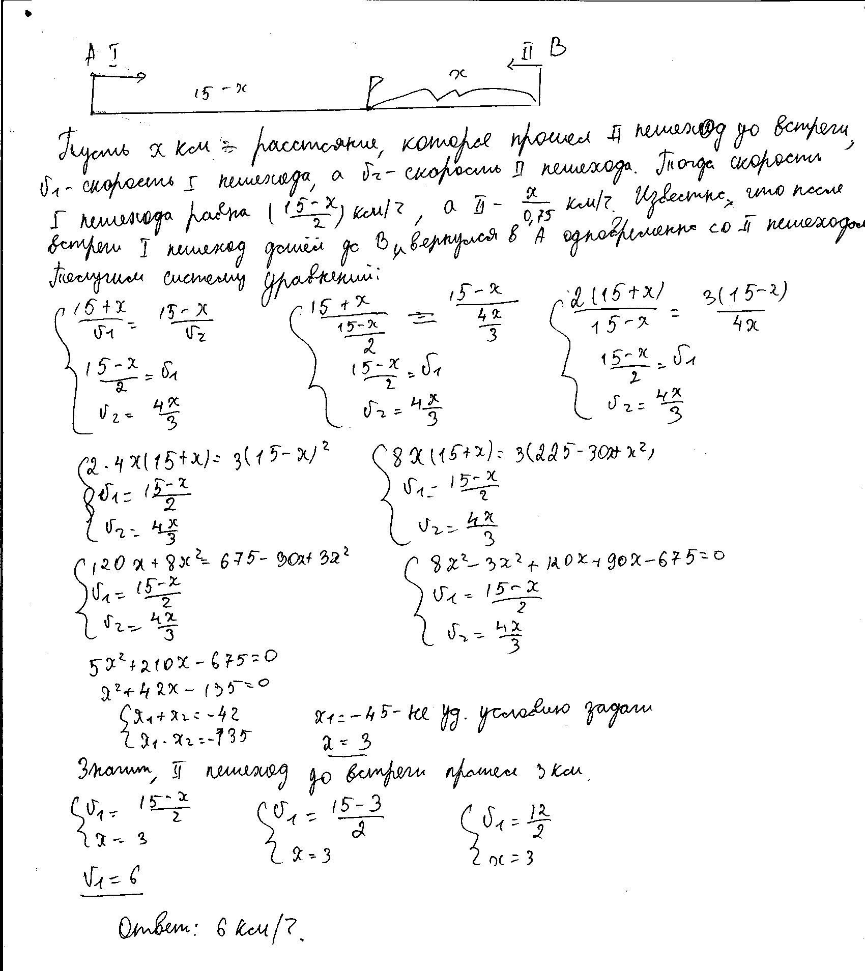 Два пешехода идут с постоянными скоростями навстречу друг другу из пунктов А и В, расстояние между которыми 15 км. Второй вышел из В на 1 ч 15 мин позже, чем первый из А, и до встречи находился в пути 45 мин. Прибыв в В, первый пешеход сразу повернул обратно. Какова скорость первого пешехода, если в А он пришел одновременно со вторым пешеходом?