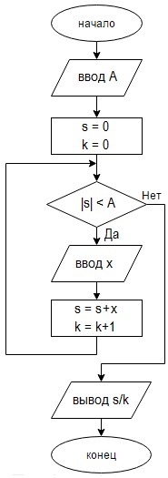 Дано число А>0. Необходимо вводить числа, пока сумма введённых чисел по модулю меньше А. Найти среднее арифметическое введённых чисел. Составить алгоритм (блок-схему) решения задачи. Привести тестовый пример