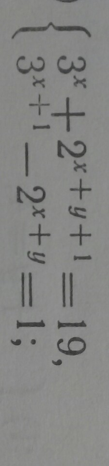 умножаем второе на 2 (6*3^x - 2*2^(x+y) = 2) и складываем со 2-м двойки в степени взаино уничтожаются и сотаются тройки в степени