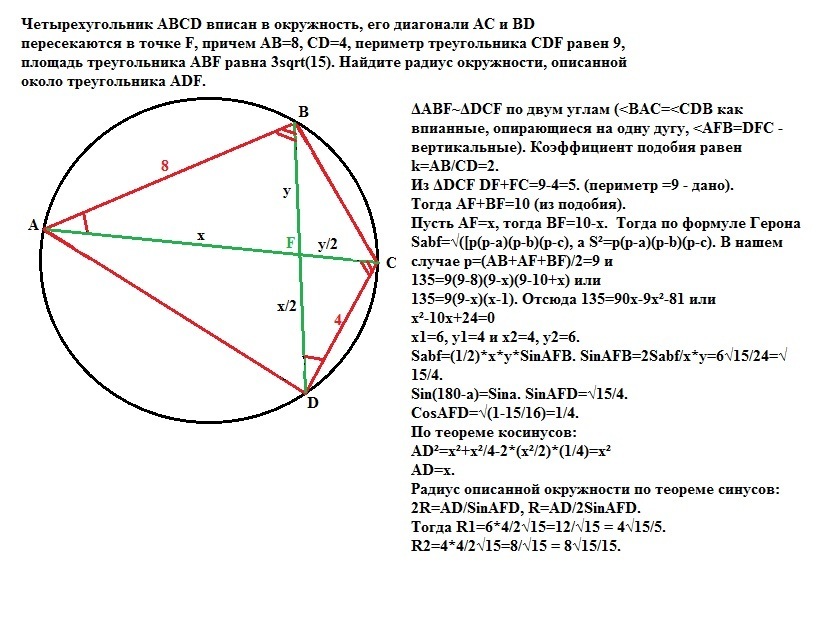 Четырехугольник ABCD вписан в окружность, его диагонали AC и BD пересекаются в точке F, причем AB=8, CD=4, периметр треугольника CDF равен 9, площадь треугольника ABF равна 3sqrt(15). Найдите радиус окружности, описанной около треугольника ADF.