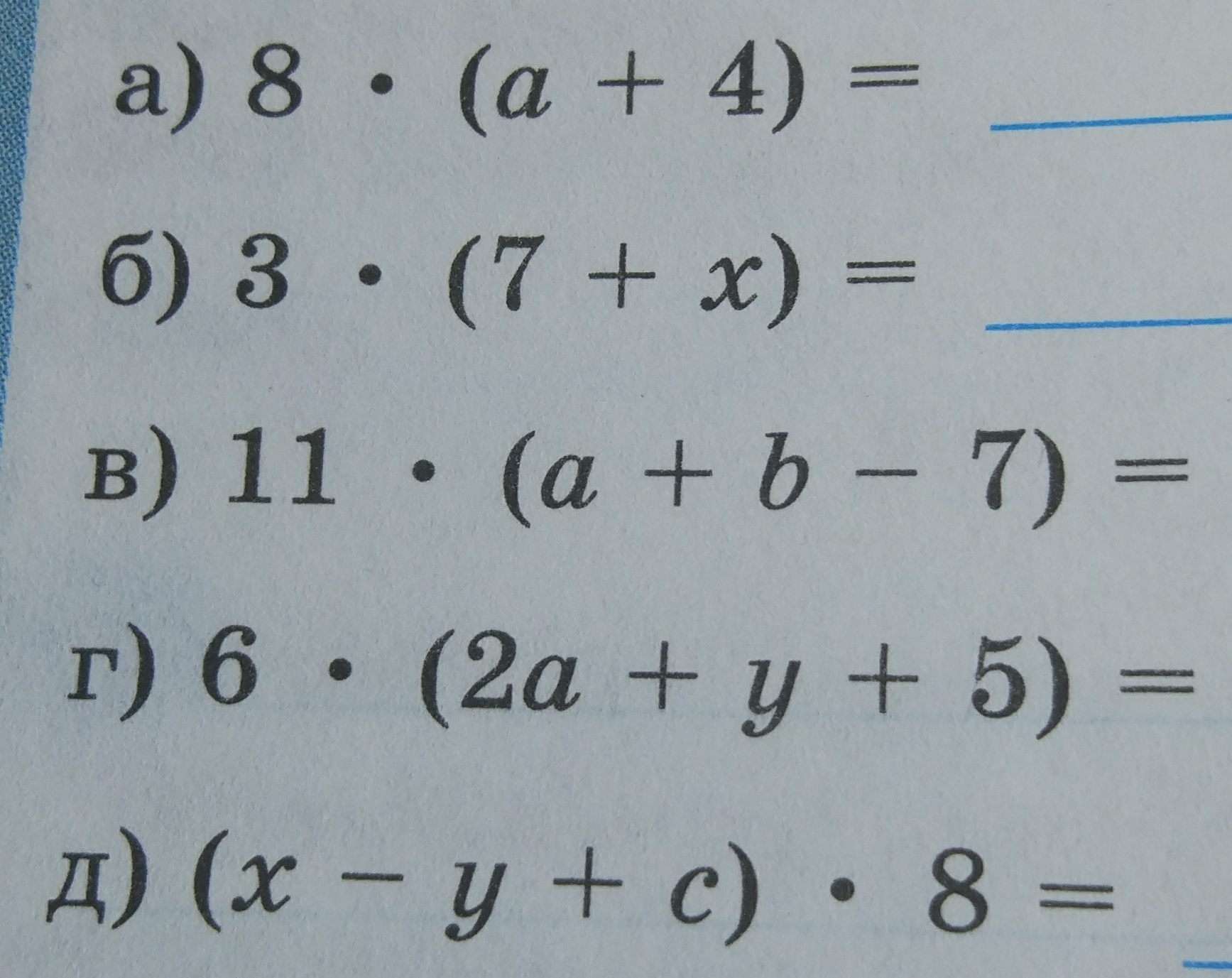 д)(x-y+c)*8=8x-8y+8c