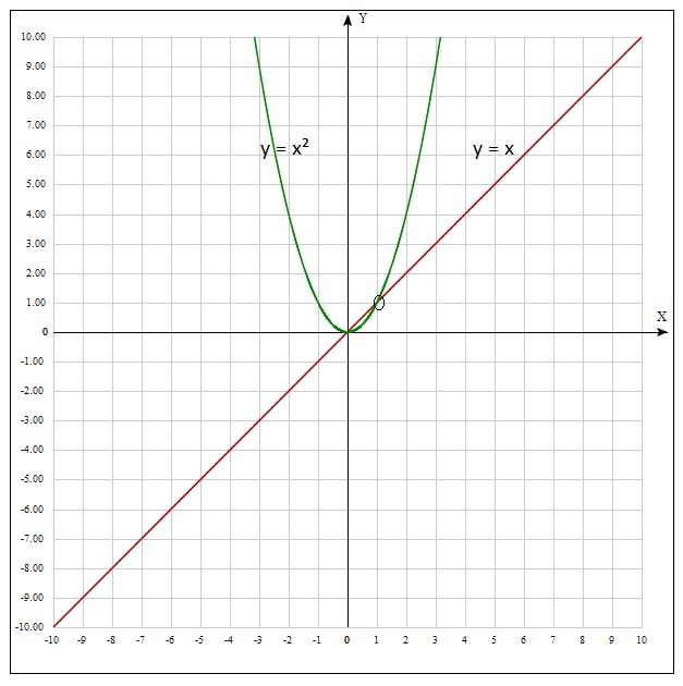 Графики пересекаются в двух точках, одна из которых выколота, т.к. не входит в область определения.