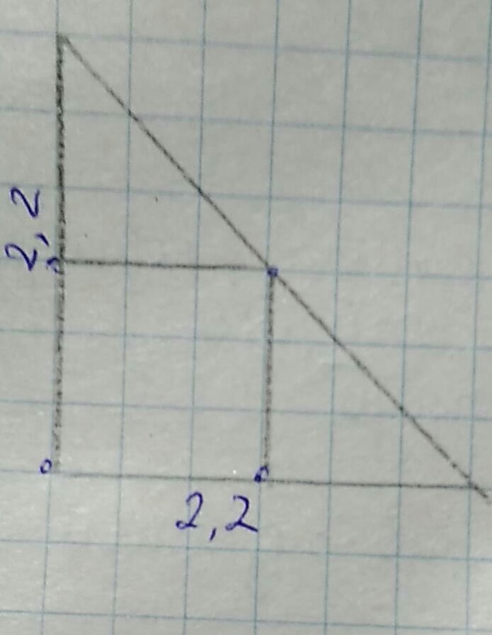 в прямоугольном треугольнике каждый катет которого равен 2,2 см вписан квадрат имеющий с ним общий прямой угол.найти периметр и площадь квадрата