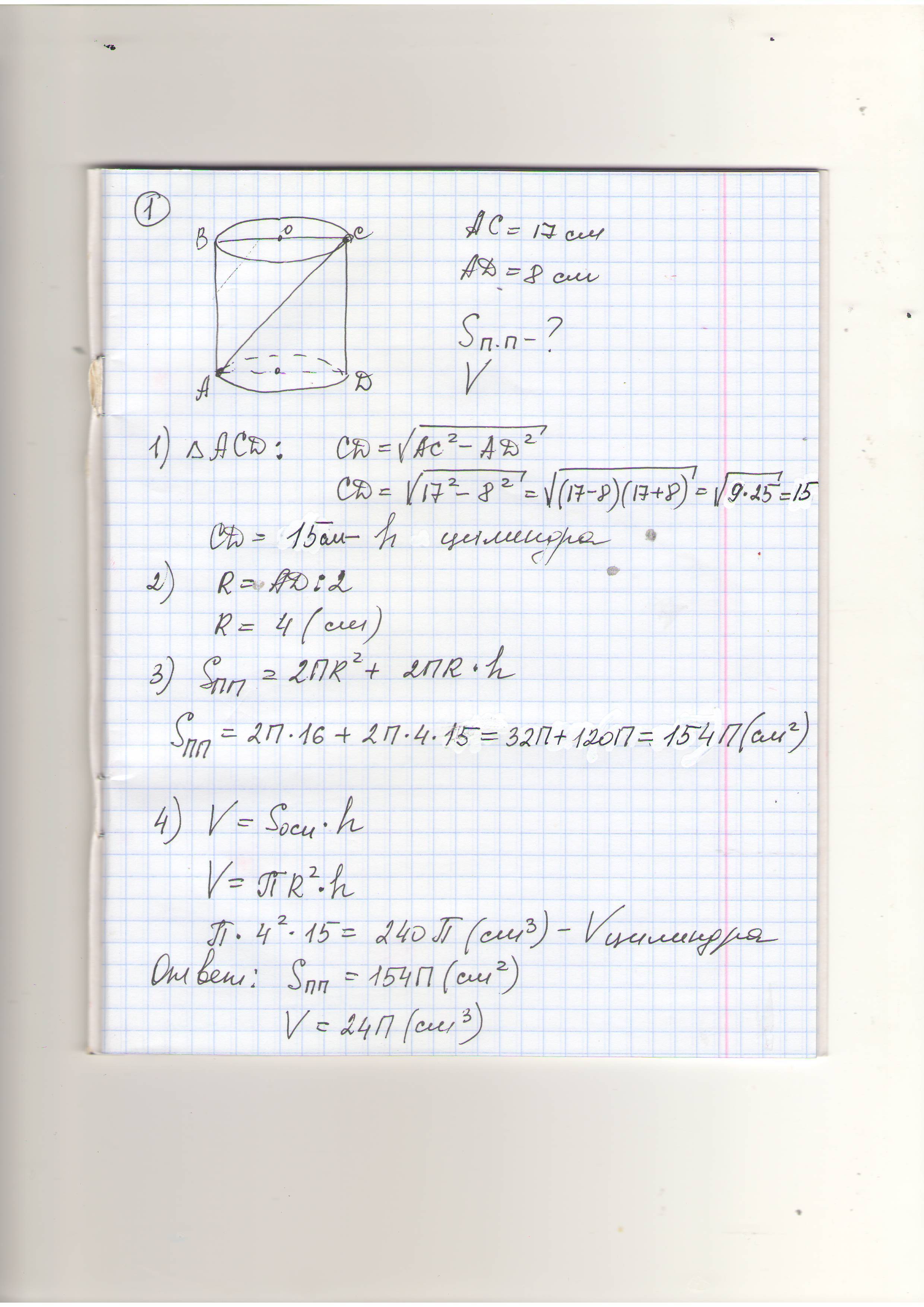 1)Сечением цилиндра является прямоугольник, диагональ которого равна 17 см, а ширина равна 8 см. Вычислить площадь полной поверхности и объём цилиндра.