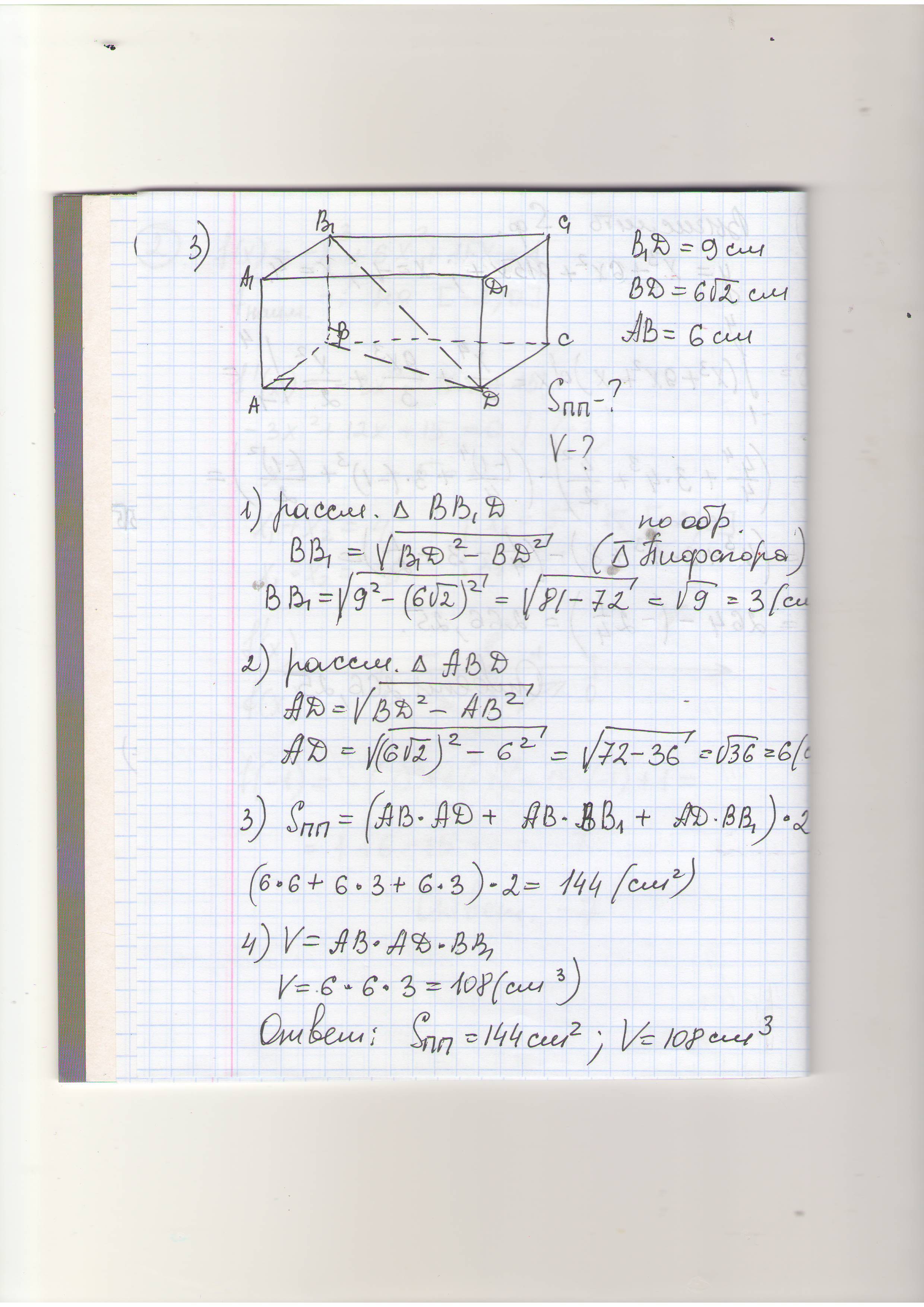 3)Диагональ прямоугольного параллелепипеда равна 9 см и образует прямоугольный треугольник с диагональю основания, которая равна 6√2 см. Ширина основания прямоугольного параллелепипеда равна 6 см. Вычислить площадь полной поверхности и объём прямоугольного параллелепипеда