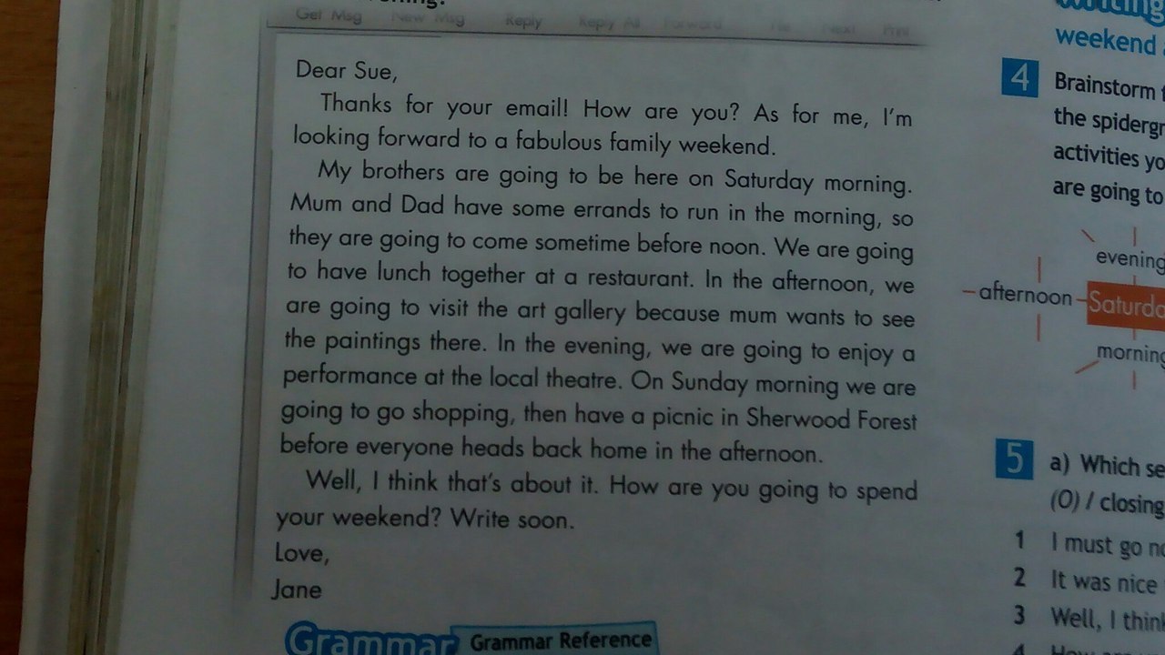 Спасибо за твое электронное письмо! Как ты? Что касается меня, то я с нетерпением жду наши невероятные семейные выходные.Мои братья будут здесь в субботу утром. У мамы и папы есть задания утром, так что они придут до полудня. Мы собираемся пообедать вместе в ресторане. Во второй половине дня мы собираемся посетить художественную галерею, потому что мама хочет посмотреть там картины. Вечером мы собираемся насладиться выступлением в местном театре. В воскресенье утром мы собираемся сходить за покупками, а потом устроить пикник в Шервудском лесу, прежде чем все отправятся по домам после полудня.