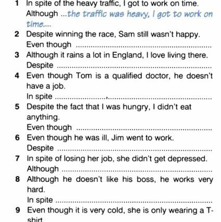 2 Even though Sam had won the race, he still wasn’t happy 3 Despite the fact that it rains a lot in England, I love living here 4 In spite of being a qualified doctor, Tom doesn’t have a job 5 Even though I was very hungry, …. 6 Despite being ill, …7 Although she had lost her job, she didn’t get depressed 8 In spite of the fact that he doesn’t like his boss, …