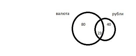 В Одном из Банков из 150 Клиентов у 80 - открыты счета в иностранной валюте , у 40 - в Рублях , а у 23 - чета в обеих валютах . Используя Диаграмму Венна ответьте на следующие Вопросы :