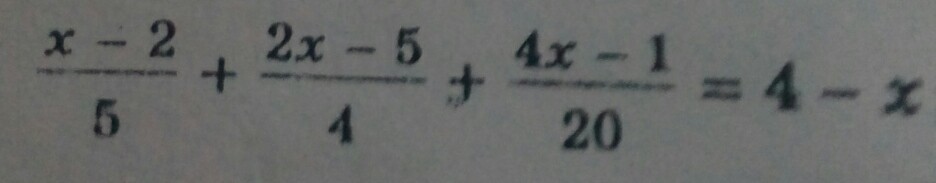 X-2/5+2x-5/4+4x-1/20=4-x; 4(x-2)+5(2x-5)+4x-1=20(4-x); 4x+10x+4x+20x=80+25+1+8; 38x=114; x=3