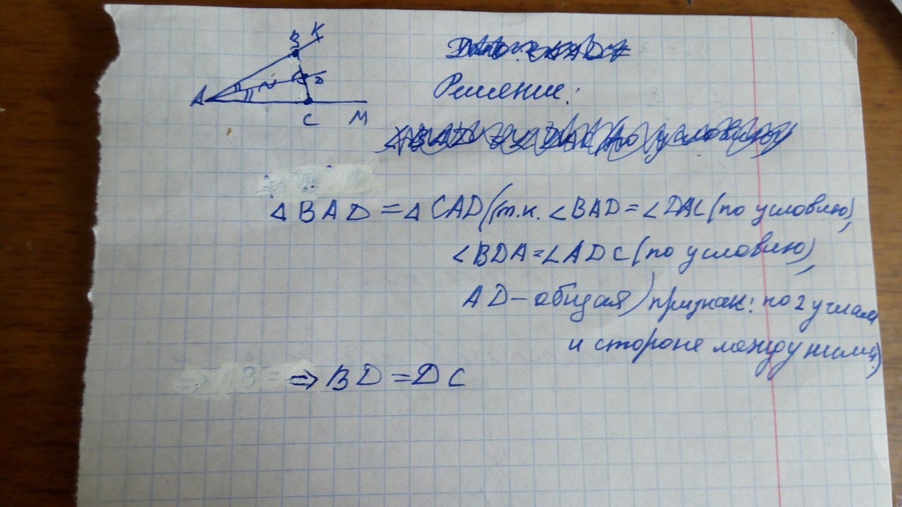 на биссектрисе угла KAM взята точка D а на сторонах этого угла -B и C такие, что угол ADB равен углу ADC , докажите что BD= CD