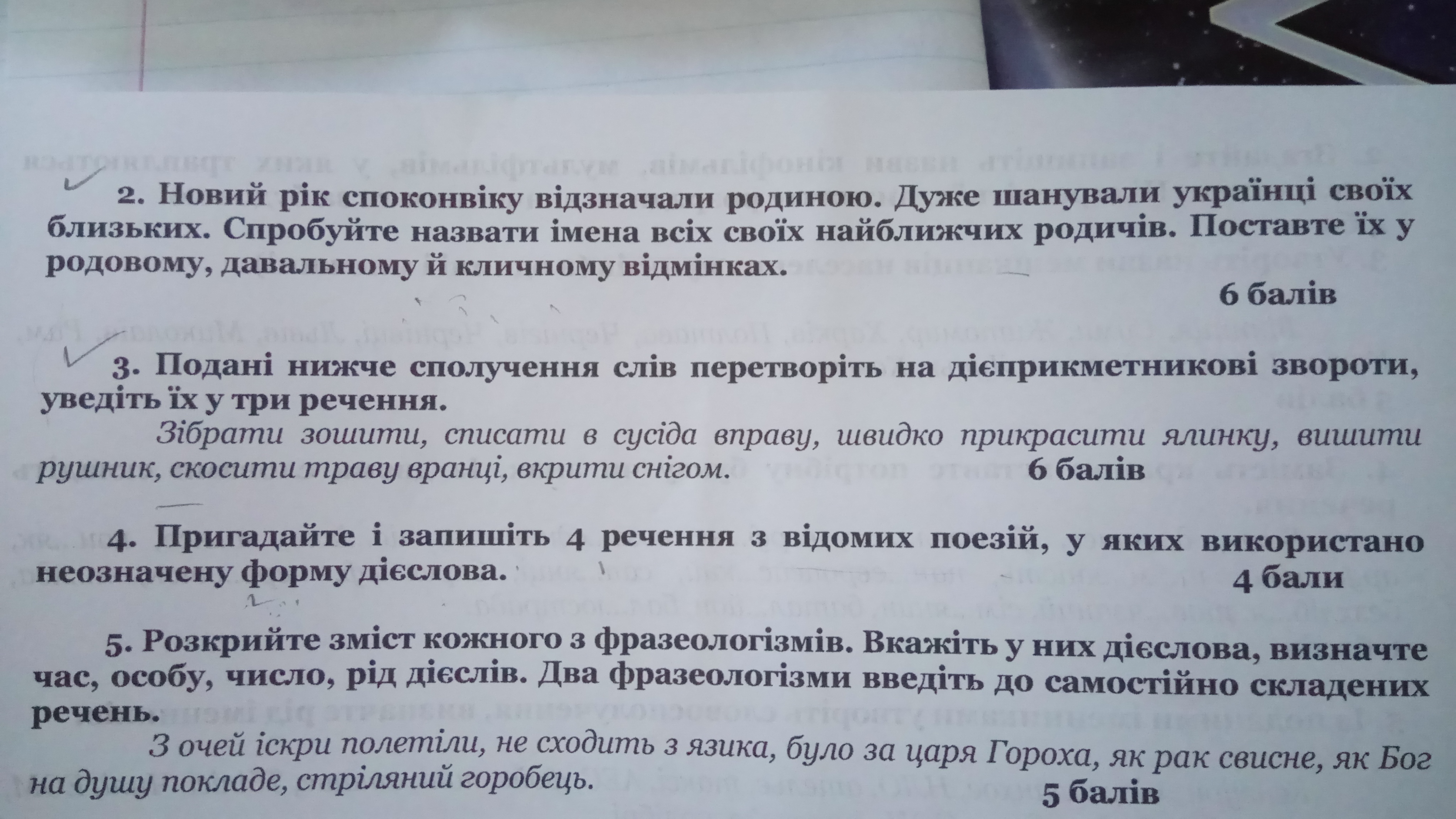 зібравши зошити, списавши в сусіда вправу, швидко прикрасивши ялинку, вишивши рушник, скосивши траву вранці, вкривши снігом