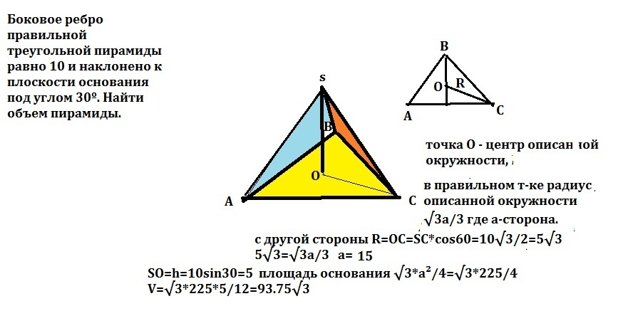Задание. Боковое ребро правильной треугольной пирамиды равно 10 и наклонено к плоскости основания под углом 30º. Найти объем пирамиды.