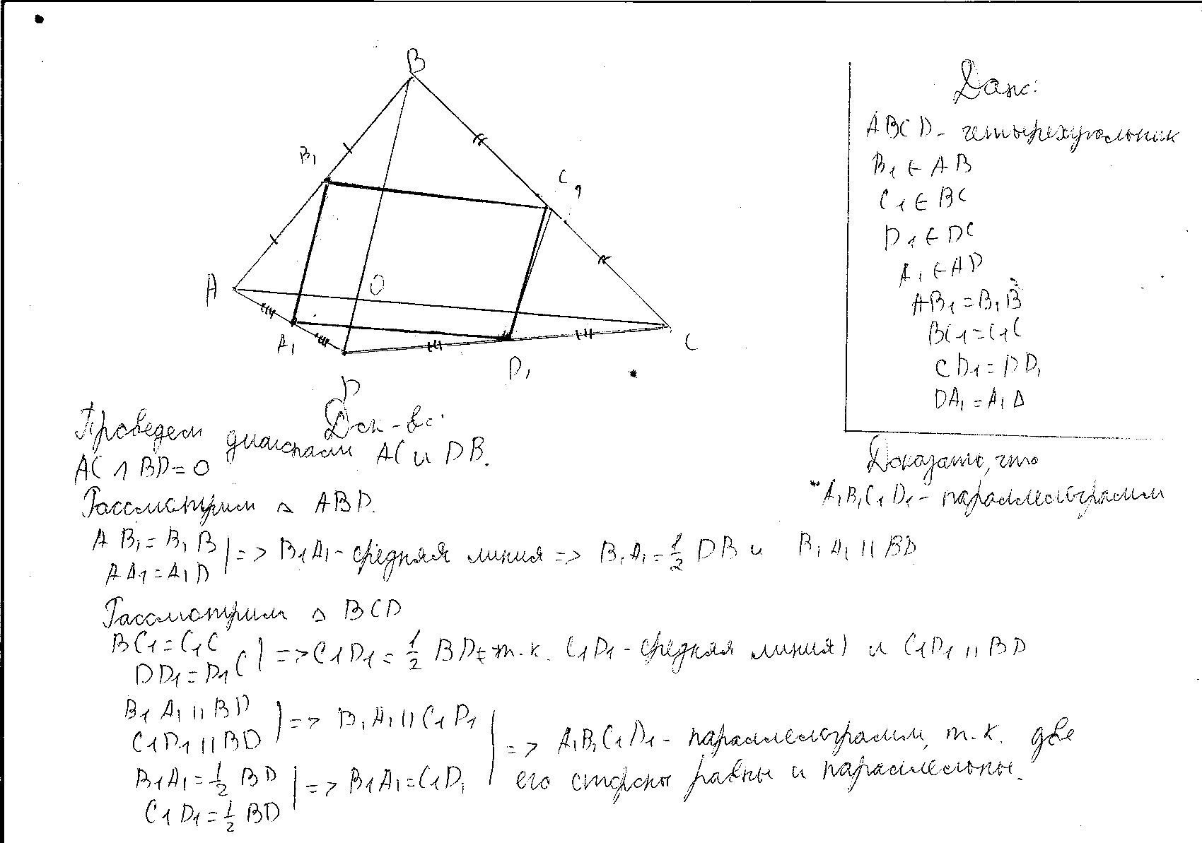 Решая задачи по геометрии, я наткнулся на вот эту задачку в школьном учебнике. Задача-> " Докажите,что середины сторон четырёхугольника являются вершинами параллелограмма. " Я просто не мог поверить в это. Я был глупцом,да и сейчас глупец,но все же я не знал этого. Целый час потратил ,но не смог найти решение у себя в голове и по учебнику,да и в нем ничего не говорится про это...