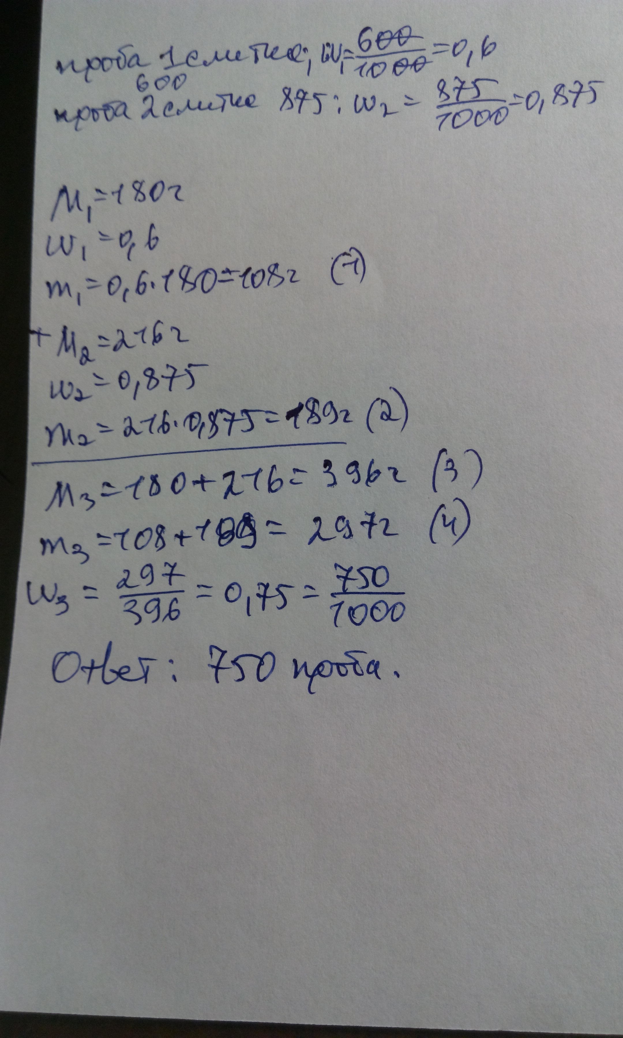 Сплавили два слитка серебра: 600-й пробы весом 180 г и 875-й пробы весом 216 г. Определить пробу сплава.