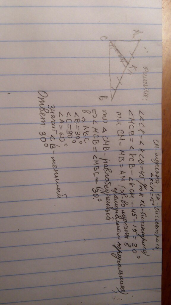 В некотором прямоугольном треугольника из вершины прямого угла провели биссектрису и медиану. Оказалось, что угол между ними равен 15∘. Найдите градусную меру меньшего угла треугольника.