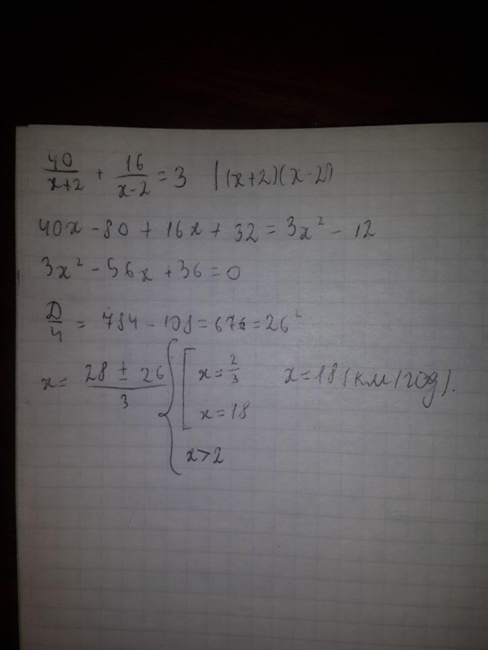 Нехай власна швидкість катера х (х>2) км/год, тоді швидкість за течією (х+2) км/год, а проти — (х-2) км/год, таким чином час, який витратив катер, пливучи за течією, складає 40/(х+2) год, а проти течії — 16/(х-2) год, що за умовою в сумі дорівнює 3. Маємо рівняння: