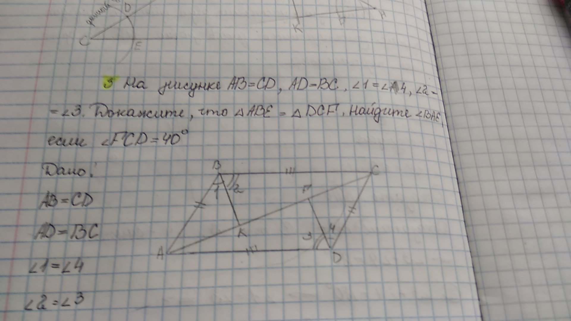 На рисунке АВ=CD, AD=BC, угол 1 = углу четыре, угол 2= углу 3. Докажите, что треугольник АВЕ= треугольнику DCF. Найдите угол BAE, если уголFCD равен 40°