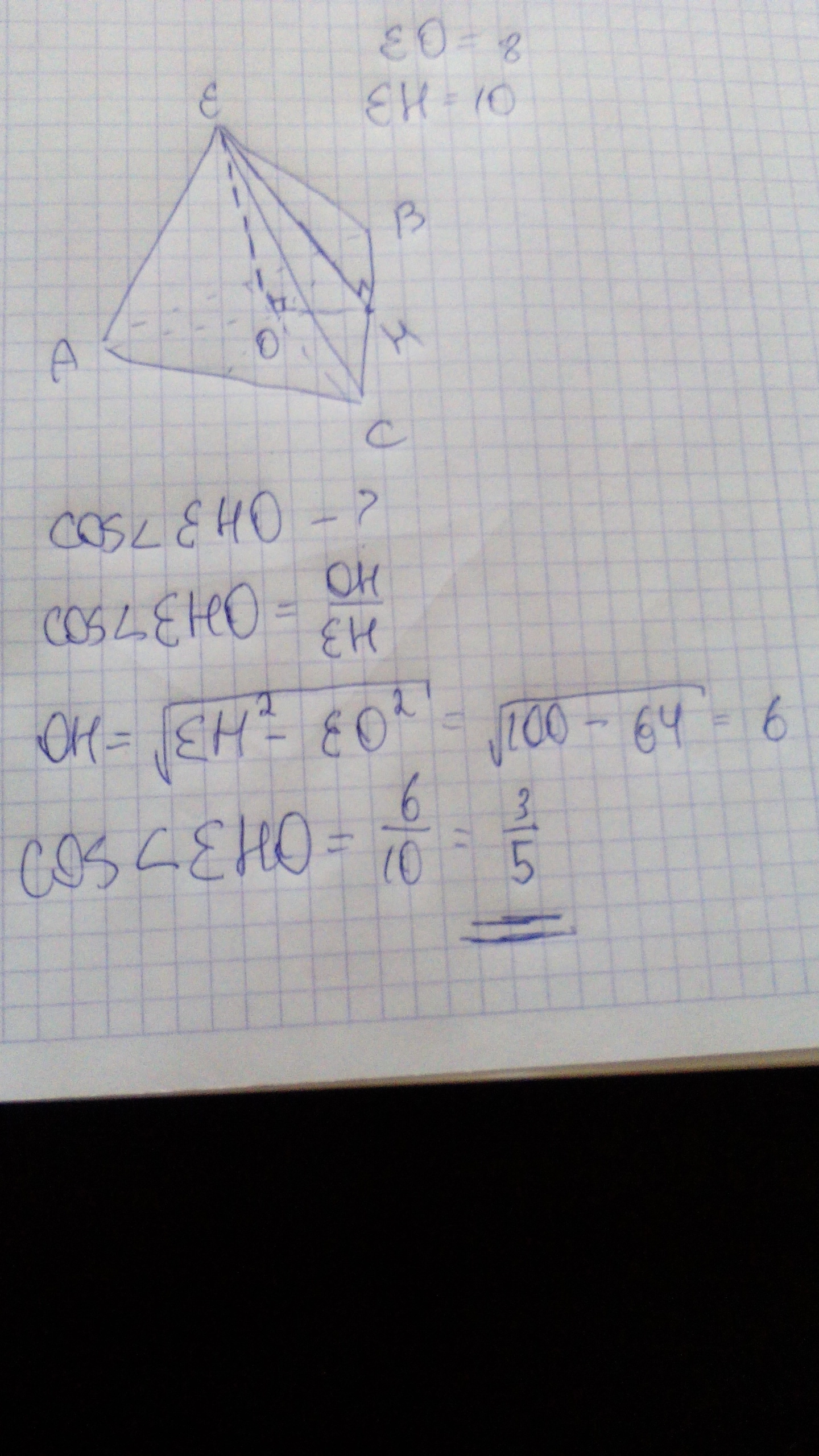 Высота правильной треугольной пирамиды равна 8, а высота боковой грани , проведённая к ребру основания равна 10. Найдите косинус угла между боковой гранью и основанием пирамиды