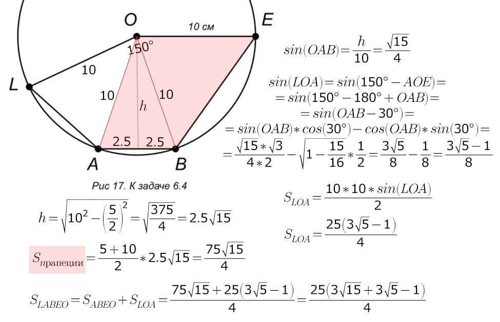 В окружности с радиусом 10см и центром O проведена хорда AB, длиной 5см, и два радиуса: OE и OL. Известно, что OE || AB, а угол EOL = 150 градусам. Найдите площадь пятиугольника EBALO.