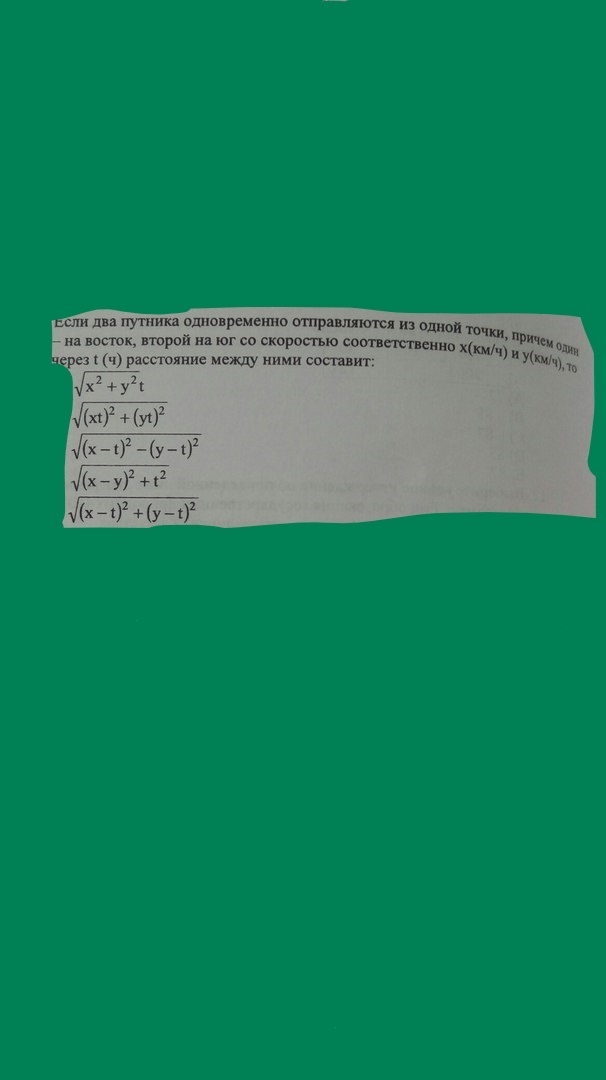 Если два путника одновременно отправляются из одной точки, причем один на восток, а второй на юг со скоростью соответственно х(км/ч) и у(км/ч), то через t(ч) расстояние между ними составит: