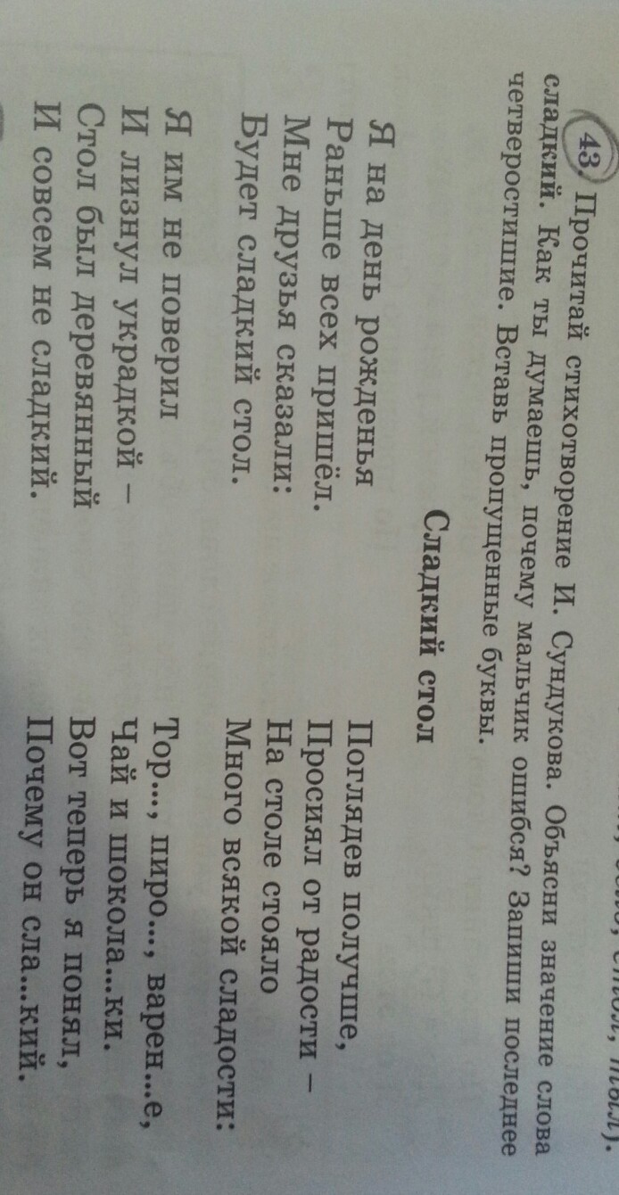 Прочитай стихотворение И.Сундукова. Объясни значение слова сладкий. Как ты думаешь, почему мальчик ошибся? Запиши последнее четверостишие.Вставь пропущенные буквы.