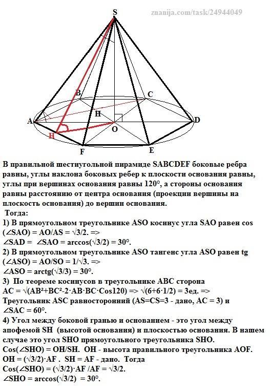 помогите решить задачи про шестиугольную пирамиду 1) В правильной шестиугольной пирамиде SABCDEF сторонаоснования равна корень из 3, а боковое ребро равно 2. Найдите угол SAD. 2) В правильной шестиугольной пирамиде SABCDEF сторона основания равна 1, а высота равна корень из 3. Найдите угол между высотой и боковым ребром. 3) В правильной шестиугольной пирамиде SABCDEF сторона основания равна корень из 3, а боковое ребро равно 3. Найдите угол SAC. 4) В правильной шестиугольной пирамиде сторона основания равна апофеме. Найдите угол между боковой гранью и основанием.