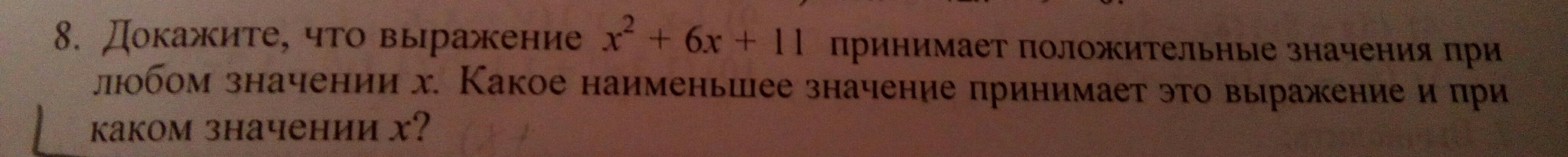 x^2+6x+11=x^2+ 6x+9+2=( x^2+6x+9)+2= (x+3)^2+2>=2 при любом х