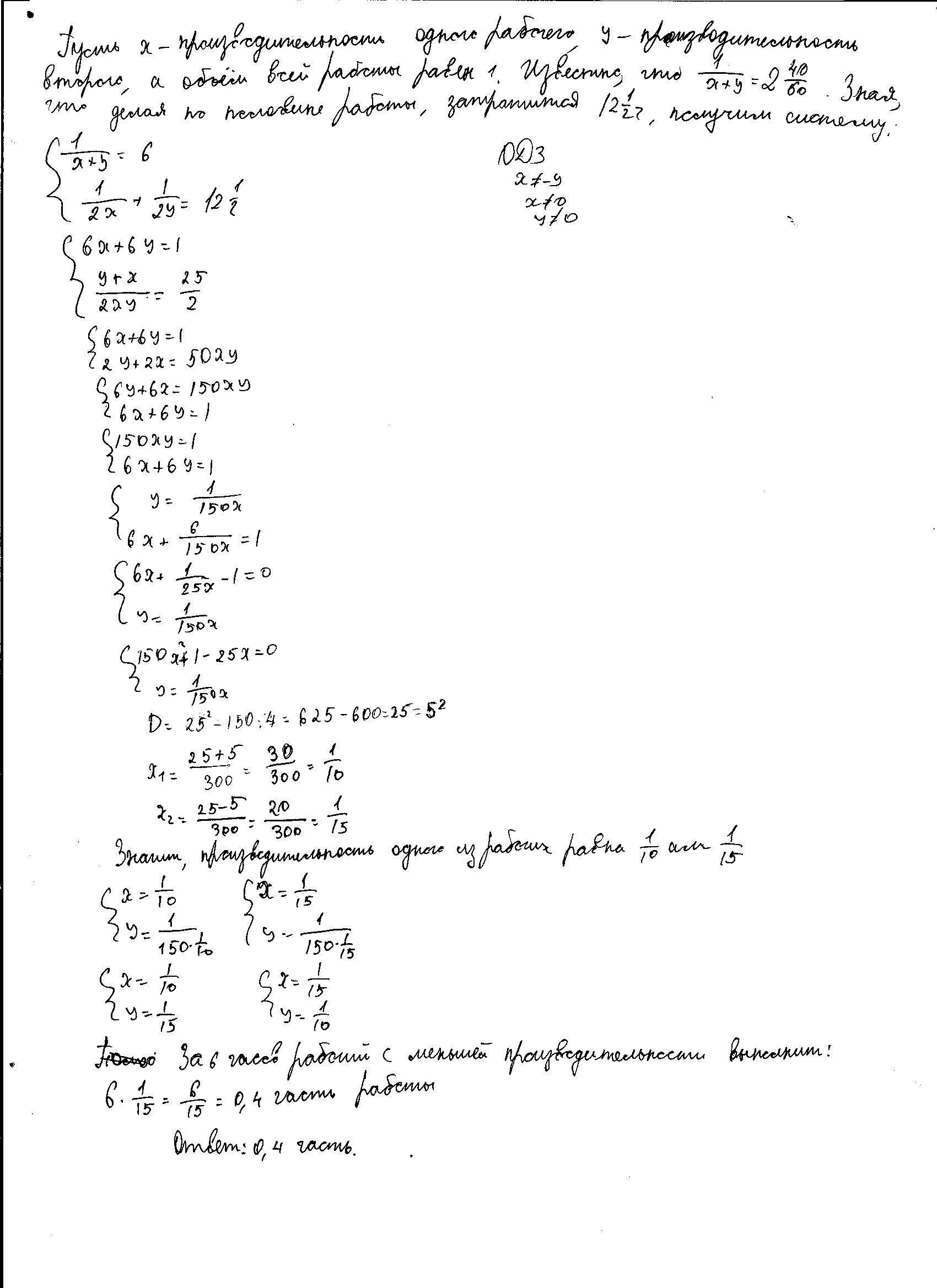При одновременной работе двое рабочих могут выполнить некоторые задания за 6 часов. Если половину задания выполнит первый рабочий , а затем оставшуюся часть- второй, то на это потребуется 12 часов 30 минут. Какую часть задания выполняет за 6 часов рабочий с меньшей производительностью?