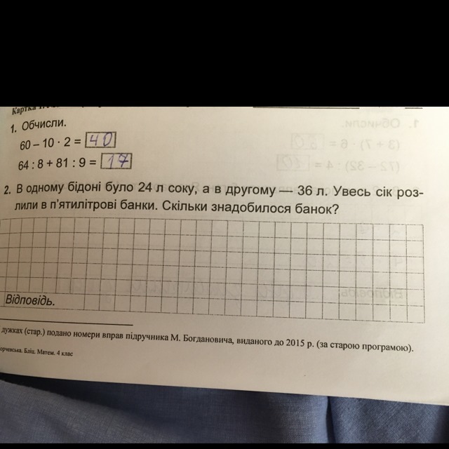 В одному бідної було 24 л соку, а в другому-36 л. Увесь сік розлили в п'яти літрові банки. Скільки знадобилося банок?