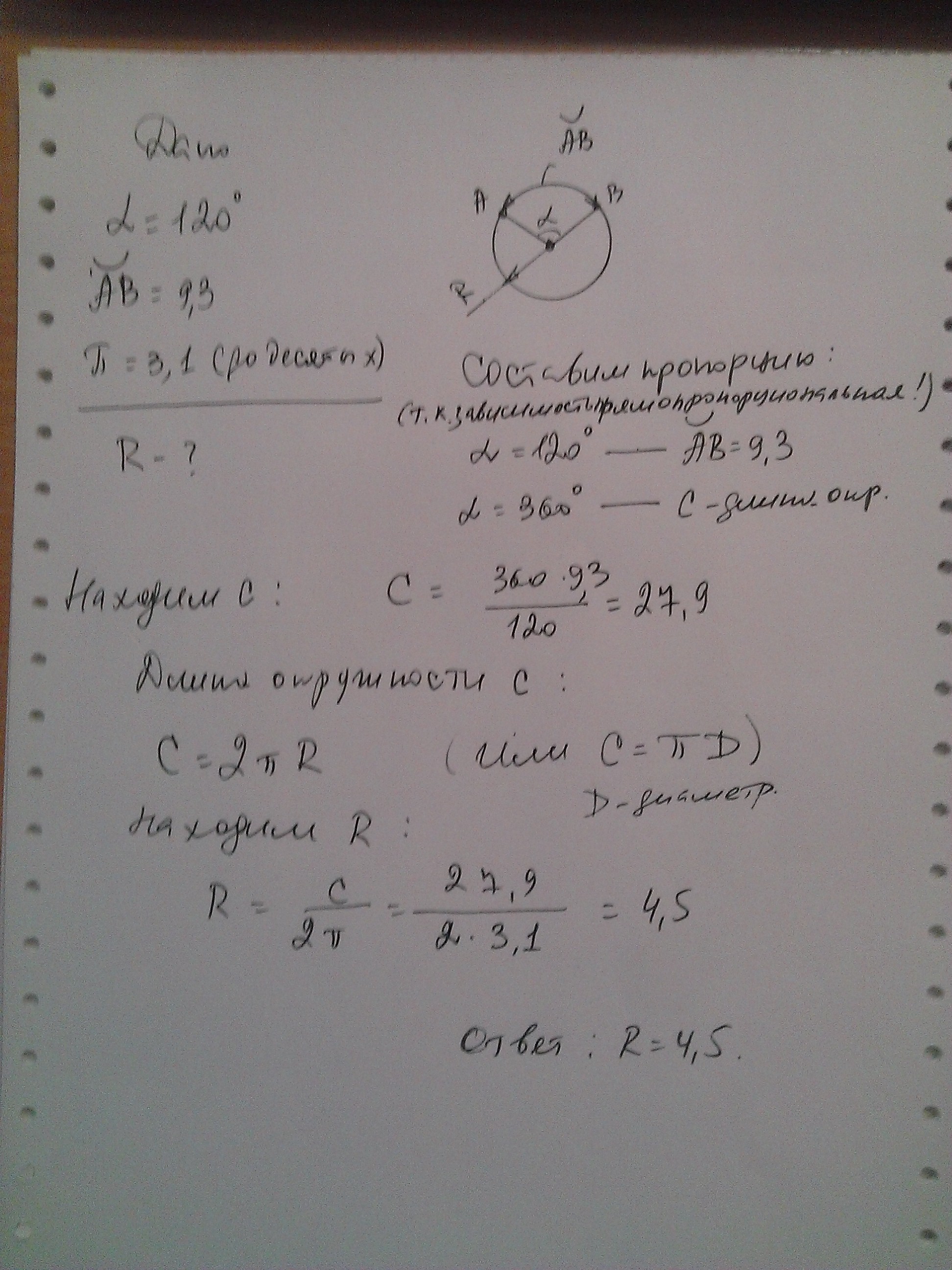 Найдите радиус окружности, если длина дуги, градусная мера которой равна 120∘, равна 9,3. Число π округлите до десятых.