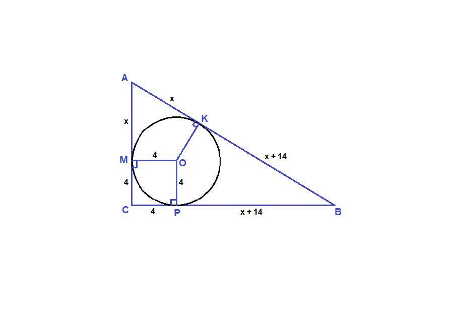 Отрезки касательных, проведенных из одной точки, равны. Обозначим один отрезок гипотенузы х, а другой х + 14. Тогда