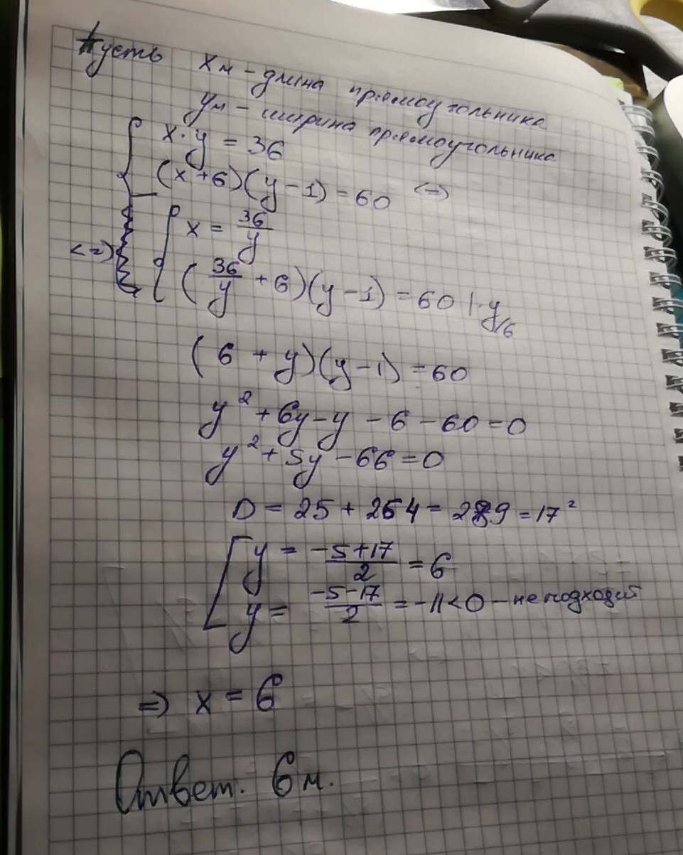 Площадь прямоугольника 36 кв.м. Если его длину увеличить на 6 м, а ширину уменьшить на 1 м, то получится прямоугольник , площадь которого равна 60 кв.м. Найти длину полученного прямоугольника. Помогите пожалуйста решить