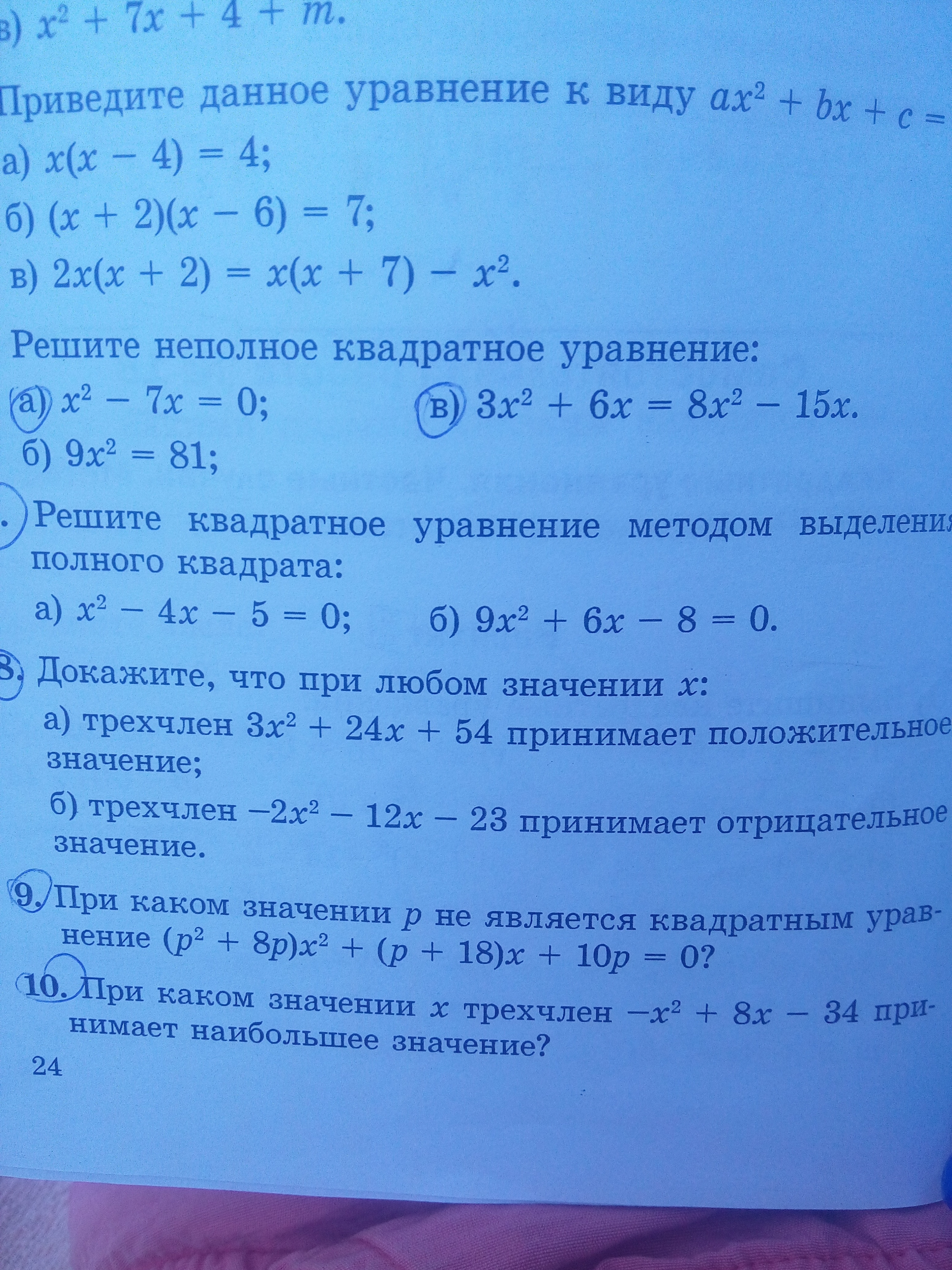 9) Уравнение не будет являться квадратным при условии что старший коэффициент равен нулю то есть p^2 + 8p = 0 p(p+8)=0 p=0 p=-8