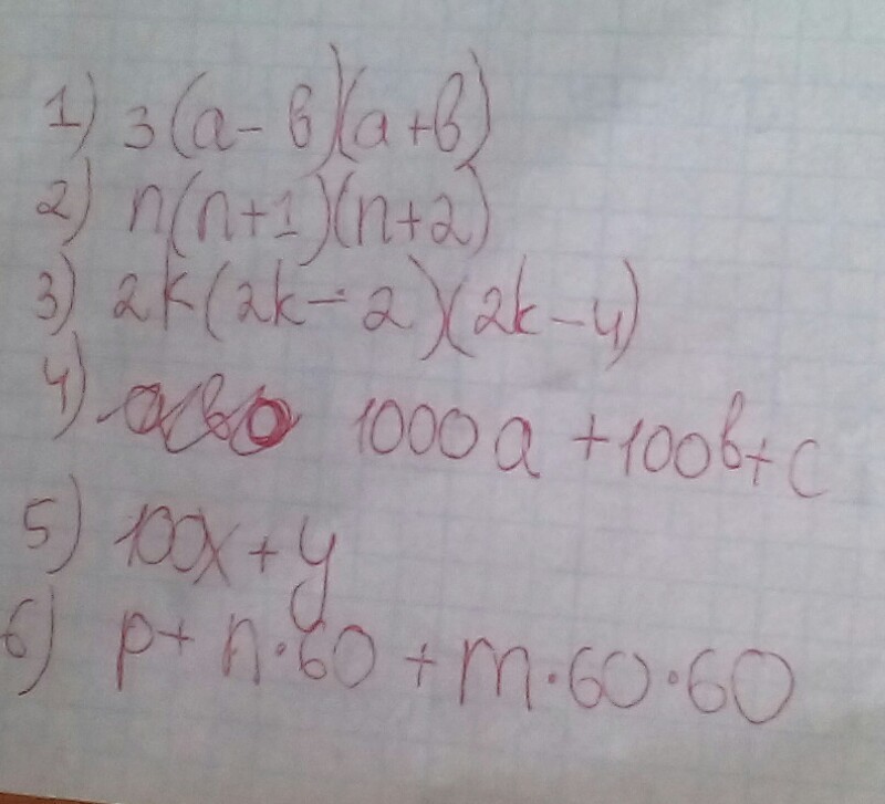 Запишіть у вигляді виразу 1) потроєнний добуток різниці чисел a і b та їхньої суми 2) суму трьох послідовних натуральних чисел, менше з яких дорівню n, 3) добуток трьох послідовних парних натуральних чисeл більш з яких дорівнюе 2k; 4) число, у якому a тисяч, b сотень і с одиниць; 5) кількість сантиметрів у х метрах і у сантиметрах; 6) кількість секунд у м годинах, n хвилинах і р секундах.