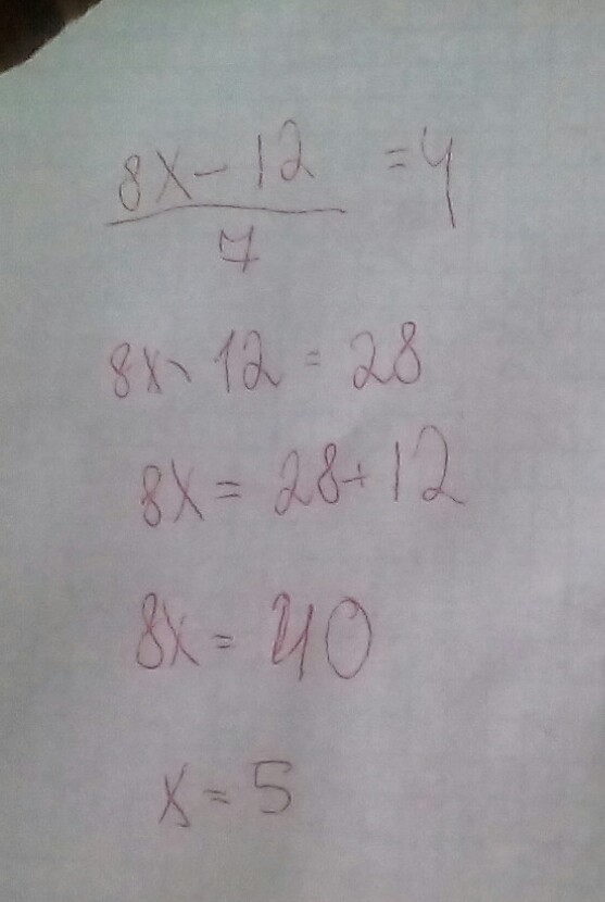 задумали число,увеличили его в 8раз,полученный результат уменьшили сначала на 12,а потом в 7раз и получили 4,какое число задумали?