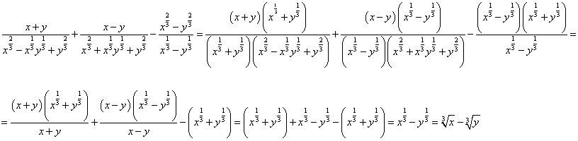 умножил в числитель и знаменатель на (x^1/3 - y^1/3) и (x^1/3 + y^1/3) и получим в знаменателе сумму и разность кубов