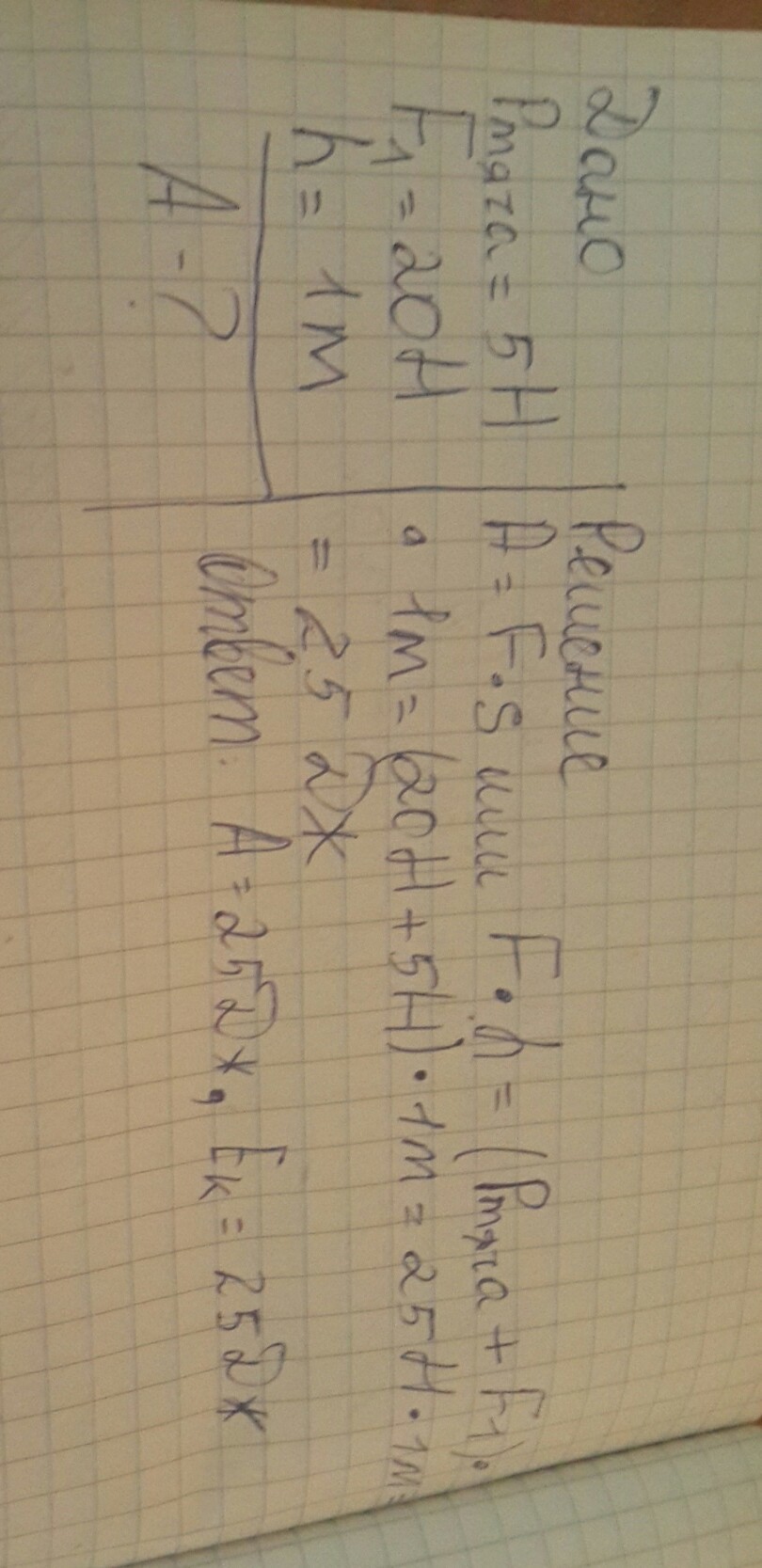 Мальчик подбрасывает мяч весом 5 Н, приложив силу 20 Н на пути 1 м. Какую работу произвел мальчик? Какую кинетическую энергию приобрел груз?