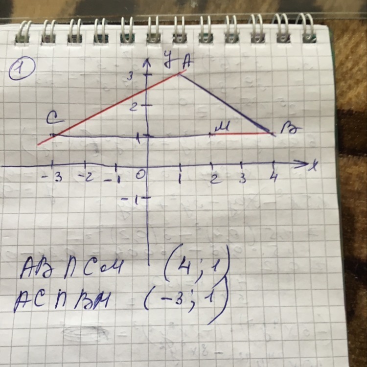 На координатной плоскости постройте отрезки АВ и СМ, еслиА(1;3), В(4;1), С(-3;1), М(2;1). Запишите координаты точек пересечения