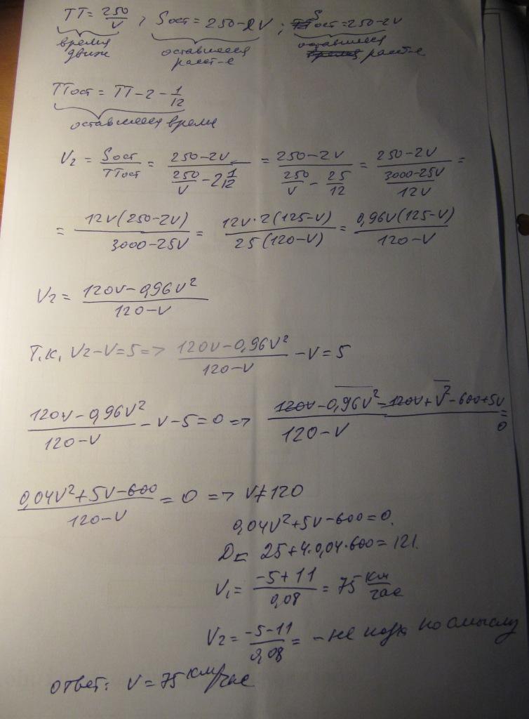 Автомобиль за определенное время должен преодолеть путь 250 км, двигаясь с постоянной скоростью. Но через 2 часа после начала движения он был задержан на 5 мин и, чтобы прибыть к месту назначения вовремя, увеличил скорость на 5 км / ч. Найдите скорость автомобиля в течение первых двух часов движения.