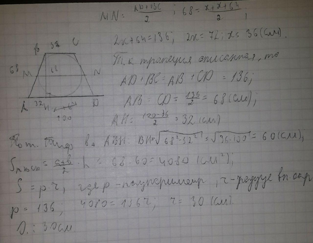 7) Средняя линия равнобедренной трапеции, описанной около круга, равна 68. Найти радиус этого круга, если нижнее основание трапеции больше верхнего на 64.