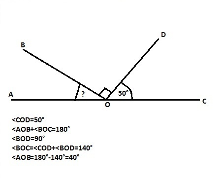 Угол АОВ и ВОС- смежные. Луч DO перпендик. К лучу ВО и делит угол ВОС на два угла. Найти угол АОВ, если угол СОD=50°