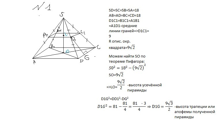 1)правильная четырехугольная пирамида,все ребра которой равны 18 см, пересечена плоскостью параллельной основанию пирамиды и проходящей через середину боового ребра,найдите высоту и апофему полученной усеченной пирамиды.