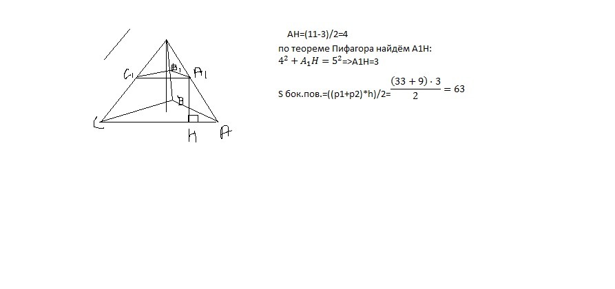 3) Найдём площадь боковой поверхности по формуле: (Р1+Р2)/2 ×h = (3×3+11×3)/2 ×3= (9+33)/2 ×3=21×3=63