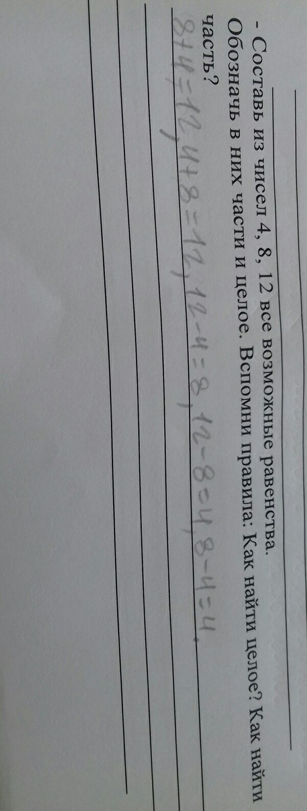 составь из чисел 4 , 8 , 12 все возможные равенства обозначь в них части и целое .вспомни правила. Как найти целое? Как найти часть?