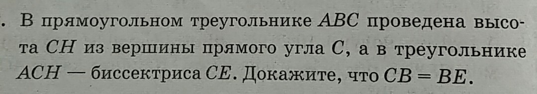 в прямоугольном треугольнике АВС проведена высота СН из вершины прямого угла С ,а в треугольнике АСН-бисс-а СЕ. Докажите что СВ=ВЕ