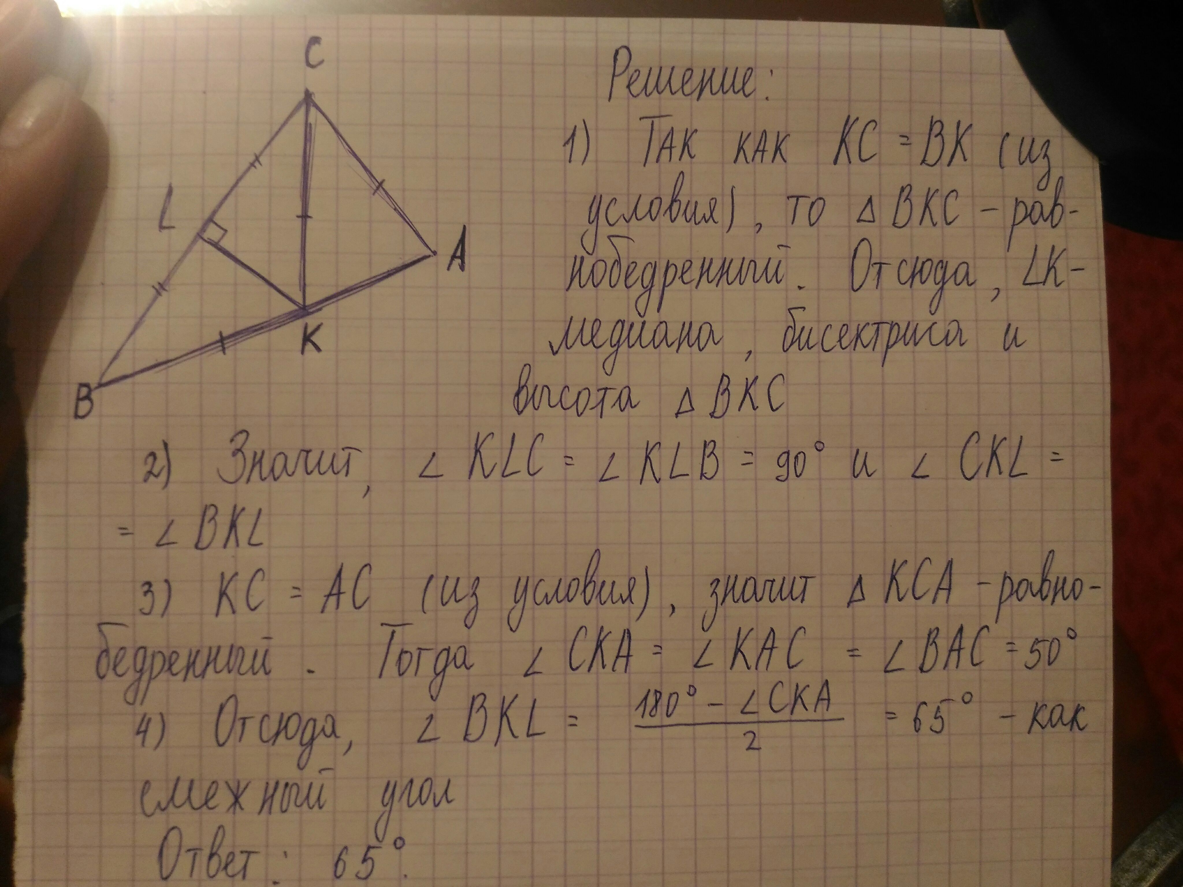 В треугольнике АВС на стороне АВ отмечена точка К такая, что АС=СК=КВ.Отрезок KL-медиана треугольника ВКС. Найдите градусную меру угла ВKL,если угол ВАС = 50 Градусов