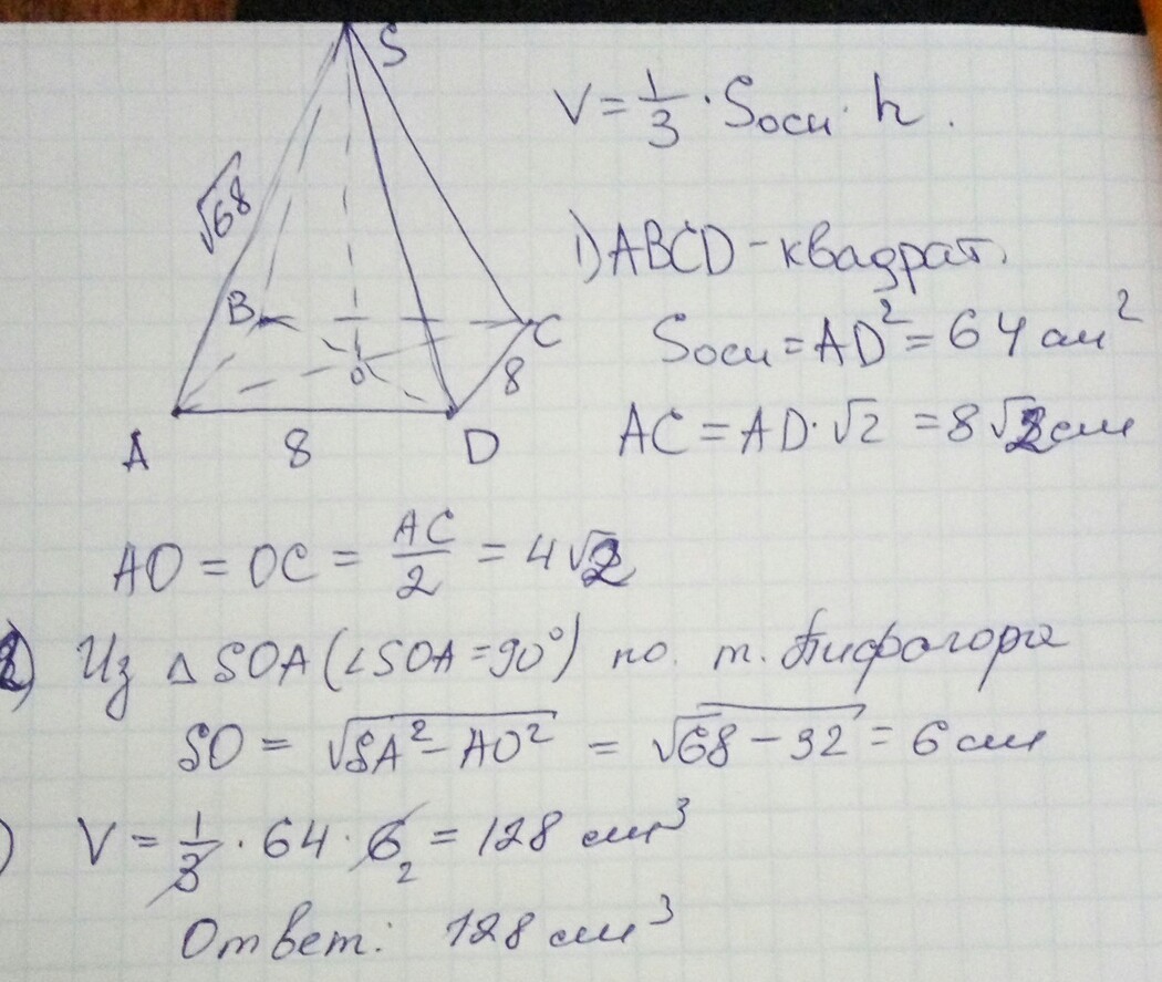 Найдите объём правильной четырёхугольной пирамиды, сторона основания которой равна 8, а боковое ребро √68.